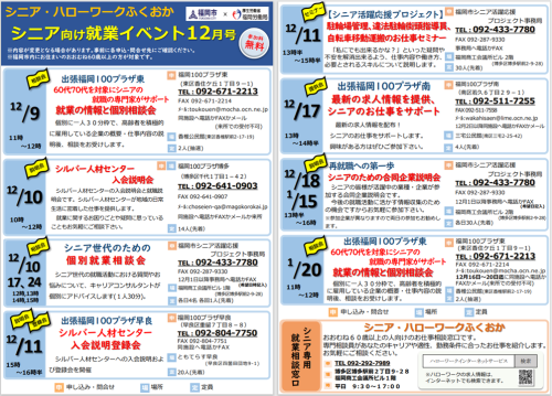 シニア活躍応援プロジェクトや市内7か所にある福岡100プラザで開催されるイベント情報です