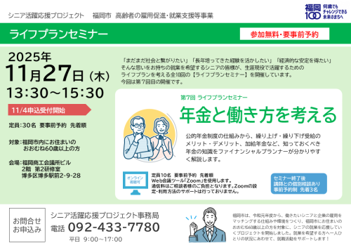 「まだまだ社会と繋がりたい」「長年培ってきた経験を活かしたい」「経済的な安定を得たい」そんな思いをお持ちの就業を希望するシニアの皆様が、生涯現役で活躍するためのライフプランを考える全10回のセミナーを開催いたします。