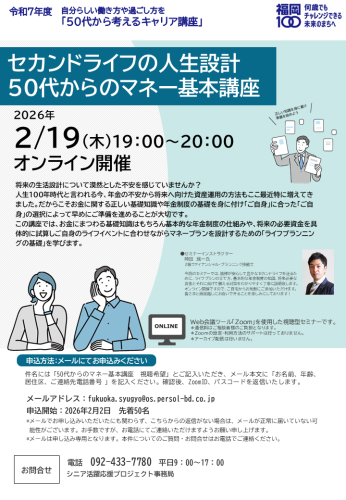 受講料は無料です。ぜひご参加ください。 対象:福岡市内にお住まいの50歳~64歳の方