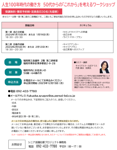 人生100年時代が間もなく到来しようとしています。こうした時代に自分らしいセカンドキャリアについて次の一歩を踏み出すきっかけづくりとして「50代から考えるキャリア講座」を実施します。